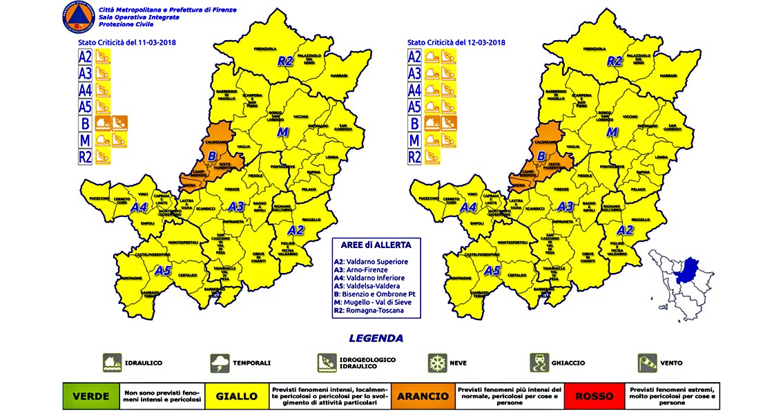 Firenze, la Protezione Civile della Città Metropolitana ha emesso un’Allerta Arancio per reticolo minore e principale per l’area Bisenzio e Ombrone Pistoiese valida fino alle ore 12:00 di lunedì 12 marzo.