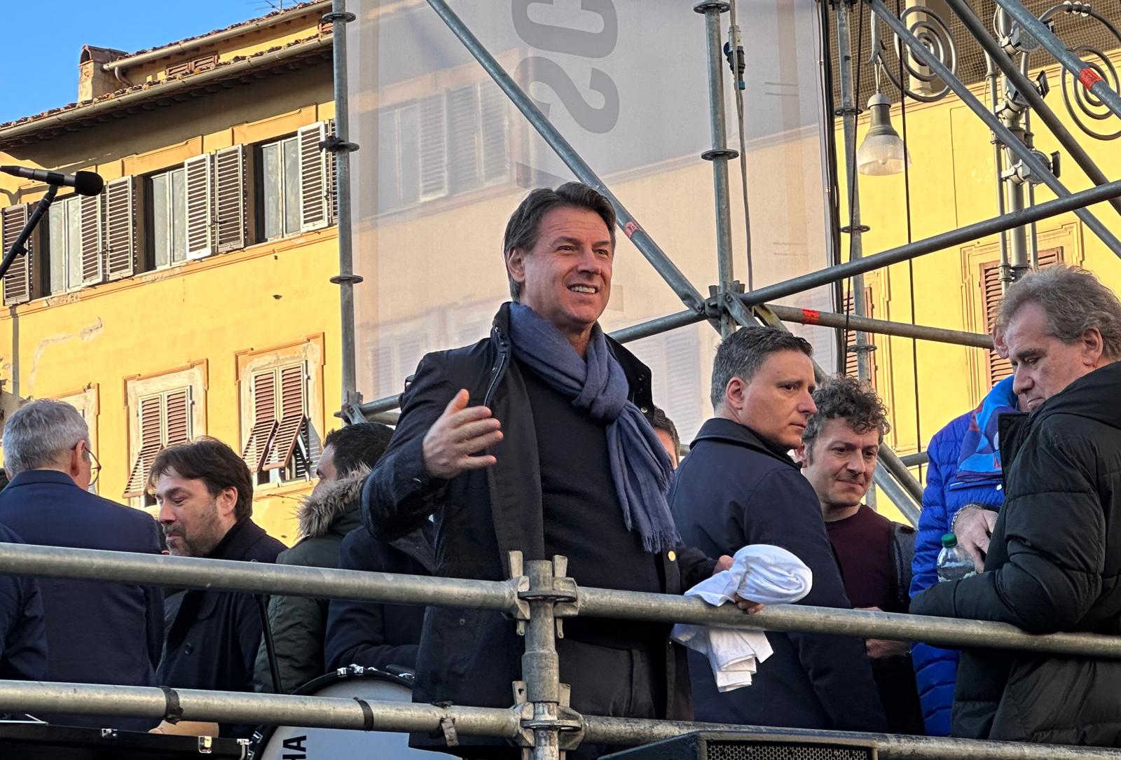 Applausi e saluti di incitamento per Giuseppe Conte, all’ingresso di piazza Santa Croce, per la chiusura della manifestazione in difesa della scuola e della Costituzione. Conte è poi salito sul palco con la segretaria del Pd, Elly Schlein e con il segretario della Cgil, Maurizio Landini.