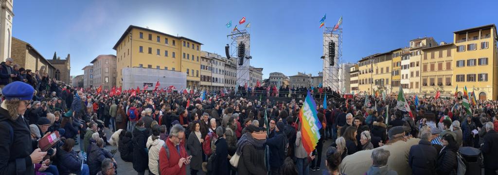 La manifestazione di Firenze si è conclusa con Bella Ciao intonata dai partecipanti in piazza Santa Croce intorno alle 17:30. Così è cominciato il deflusso dei manifestanti. Tra i leader, Schlein e Conte hanno lasciato il palco alcuni minuti prima. Landini con gli organizzatori ha atteso la fine sul palco.