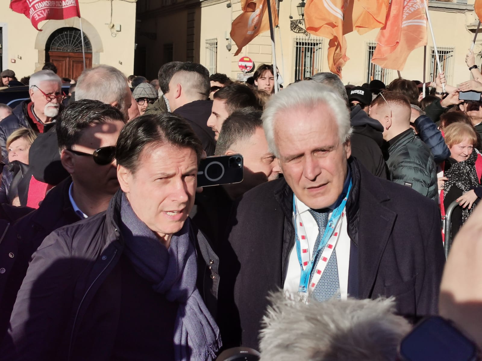 Applausi e saluti di incitamento per Giuseppe Conte, all’ingresso di piazza Santa Croce, per la chiusura della manifestazione in difesa della scuola e della Costituzione. Conte è poi salito sul palco con la segretaria del Pd, Elly Schlein e con il segretario della Cgil, Maurizio Landini.