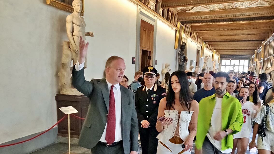 Firenze, un tour completo del Museo degli Uffizi con il direttore Eike Schmidt, la ‘superstar’ Dua Lipa, rimane incantata dalla bellezza del museo e lo visita per oltre due ore e mezzo.