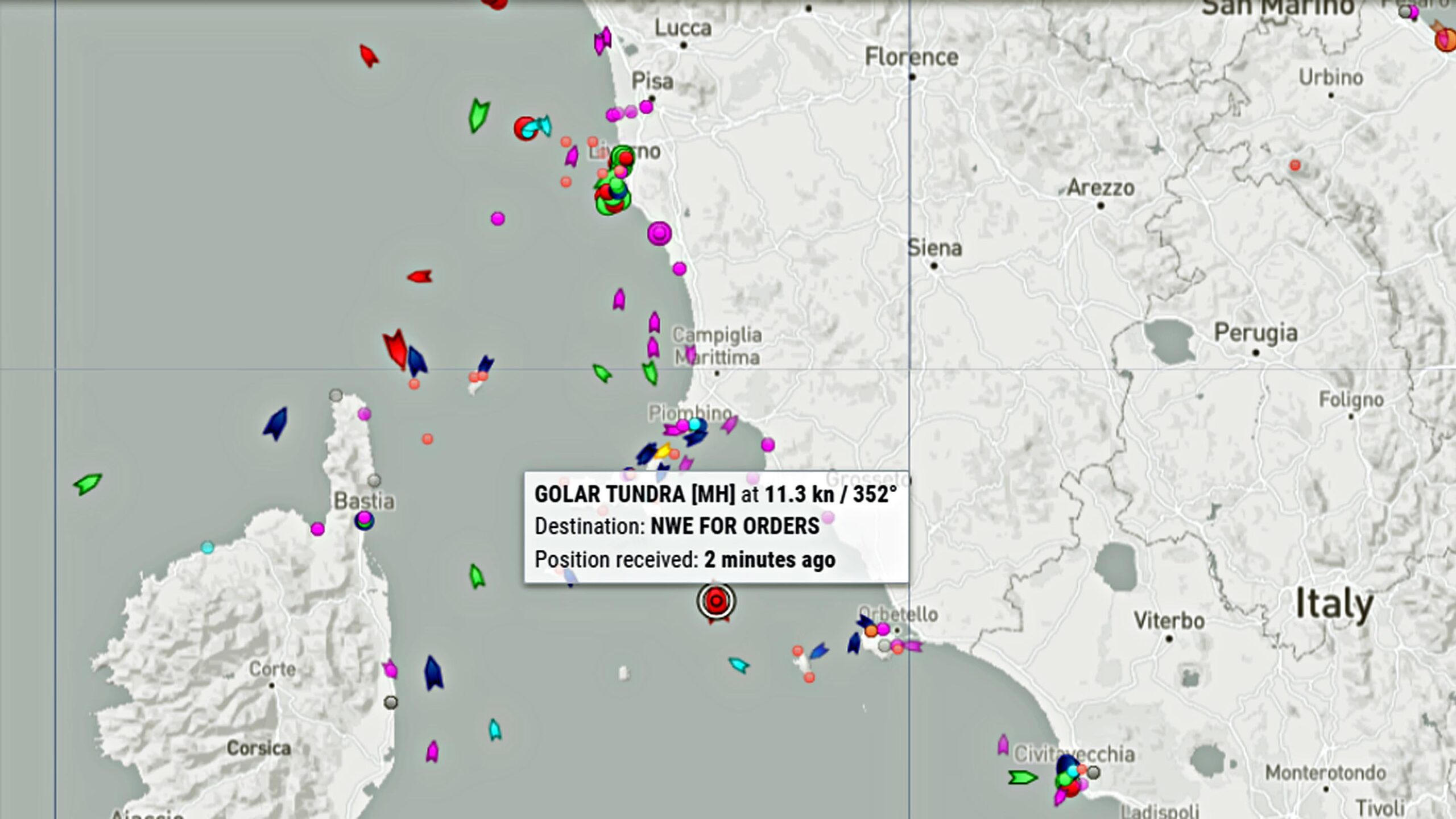 Piombino, la nave rigassificatrice Golar Tundra di Snam ha raggiunto il tratto di mar Tirreno davanti alle coste della Toscana e naviga oltre l’isola del Giglio e l’isola di Montecristo.
