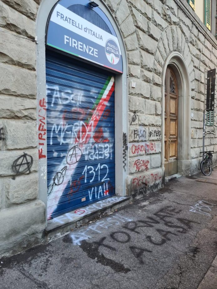 “Usano odio e violenza poi magari vanno in piazza a chiedere la pace. I fascisti rossi di Firenze”. Lo ha scritto su Facebook Paolo Marcheschi, senatore fiorentino di Fratelli d’Italia, commentando l’imbrattamento della sede di FdI a Firenze con scritte sulla saracinesca, sul muro adiacente, e sul tratto di marciapiede antistante.