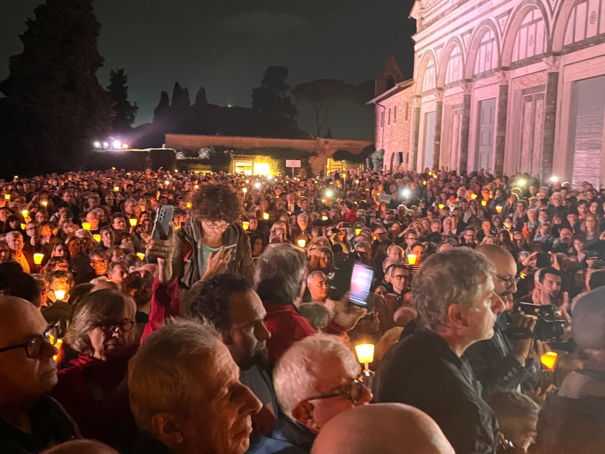 Sono felicissima di essere qui, voglio dirlo a tutti”. Rossella, insegnante di scuola media fa brillare il suo entusiasmo alla luce di una candela, quella che ha illuminato il suo cammino da Ponte alle Grazie fino all’abbazia di San Miniato al Monte. Insieme a lei, per chiedere pace tra due popoli in guerra, per chiedere la liberazione degli ostaggi e “almeno per una volta – come ha scritto Padre Bernardo Gianni, priore di San Minato che ha promosso la fiaccolata – per superare i puntigliosi distinguo” tra persone di fede e cultura diverse, c’erano migliaia di persone. Una varia umanità che avrebbe fatto piacere a Giorgio La Pira e a Giovanni Michelucci, con l’uomo cuore pulsante di una città che cresce e si misura intorno alle esigenze di ciascuno, al bisogno di essere un unico corpo sotto la sola bandiera della pace. Una parola potente, scandita dal passo silenzioso di tanti, uniti senza paura di esserlo, privati cittadini insieme ad associazioni, politici, sindacati. In testa al corteo Padre Bernardo fianco a fianco all’Imam di Firenze, Izzedin Elzir e al Rabbino capo della comunità ebraica, Gadi Piperno. Oltre a loro, il sindaco Dario Nardella, il presidente della Regione Eugenio Giani e la vicepresidente Stefania Saccardi, le assessore Maria Federica Giuliani, Benedetta Albanese e Sara Funaro, solo per citarne alcuni. “L’unico modo per arrivare ad accordi e tacitare le armi è partecipare a questa manifestazione mettendo insieme tutti gli attori, che sono chiamati a fare un percorso di condivisione; tutto il mondo è invitato a parlare parole di pace”. Così Sabrina, della Funzione Pubblica della CGIL, a due passi dall’unica bandiera ammessa che sventolava alta, quella con i colori dell’arcobaleno. Ha spiegato Franco Vaccari, presidente di Rondine Cittadella della Pace: “Dobbiamo svelenire il cuore e la mente e tornare con una mentalità nuova, per questo lavoriamo con ragazzi a coppie di nemici, russi e ucraini, palestinesi e israeliani, serbi e kosovari…in un programma di due anni dove questi giovani coraggiosi non si lasciano sopraffare dalla rabbia, dall’odio e la violenza trasformando i loro conflitti in energia vitale”. Mano nella mano, sparsi tra la gente, c’erano anche loro, gli studenti dai Paesi in conflitto, gli adulti di domani cui è affidata la costruzione di un futuro migliore. Così, sopra le sponde dell’Arno, un altro fiume fatto di persone di ogni età e provenienza ha preso a ingrossarsi, creando una mobilitazione che rimanda a quella del 2002, quando un milione di cittadini manifestarono contro la guerra in Iraq. Un movimento che oggi come ieri chiede NO alla guerra, lo fa in modo composto, anche quando il fiato si è fatto più corto salendo le centinaia di scalini delle rampe di San Niccolò fino al Piazzale Michelangelo, e ancora più sù, a raggiungere il sagrato della Chiesa. Qui, Padre Bernardo ha parlato per pochi minuti, tanti sono bastati per infiammare un mare umano visibile ormai al solo riverbero della luna e delle candele. “La mia gratitudine è per il rabbino Gadi e per l’Imam Izzedin, perché la loro presenza stasera è un dono di pace, una profezia di coraggio e di libertà. Firenze abbraccia il vostro dolore e sostiene le vostre speranze, Firenze sogna pace per le vostre terre.” Si è chiusa così una giornata destinata a segnare il passo lento, silenzioso ma costante di un movimento globale pacifista che nel capoluogo toscano ritrova le sue radici.