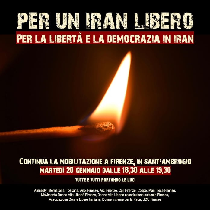 Dopo la partecipata manifestazione nazionale tenutasi a Roma il 16 gennaio scorso Amnesty International Toscana, insieme a diverse organizzazioni attive sul territorio, martedi 20 gennaio 2026 sarà presente in Piazza Sant’Ambrogio (dalle 18.30 alle 19.30) in occasione della mobilitazione “Per un Iran Libero” per esprimere solidarietà alla popolazione iraniana, che manifesta per reclamare diritti e giustizia sfidando la repressione più brutale.