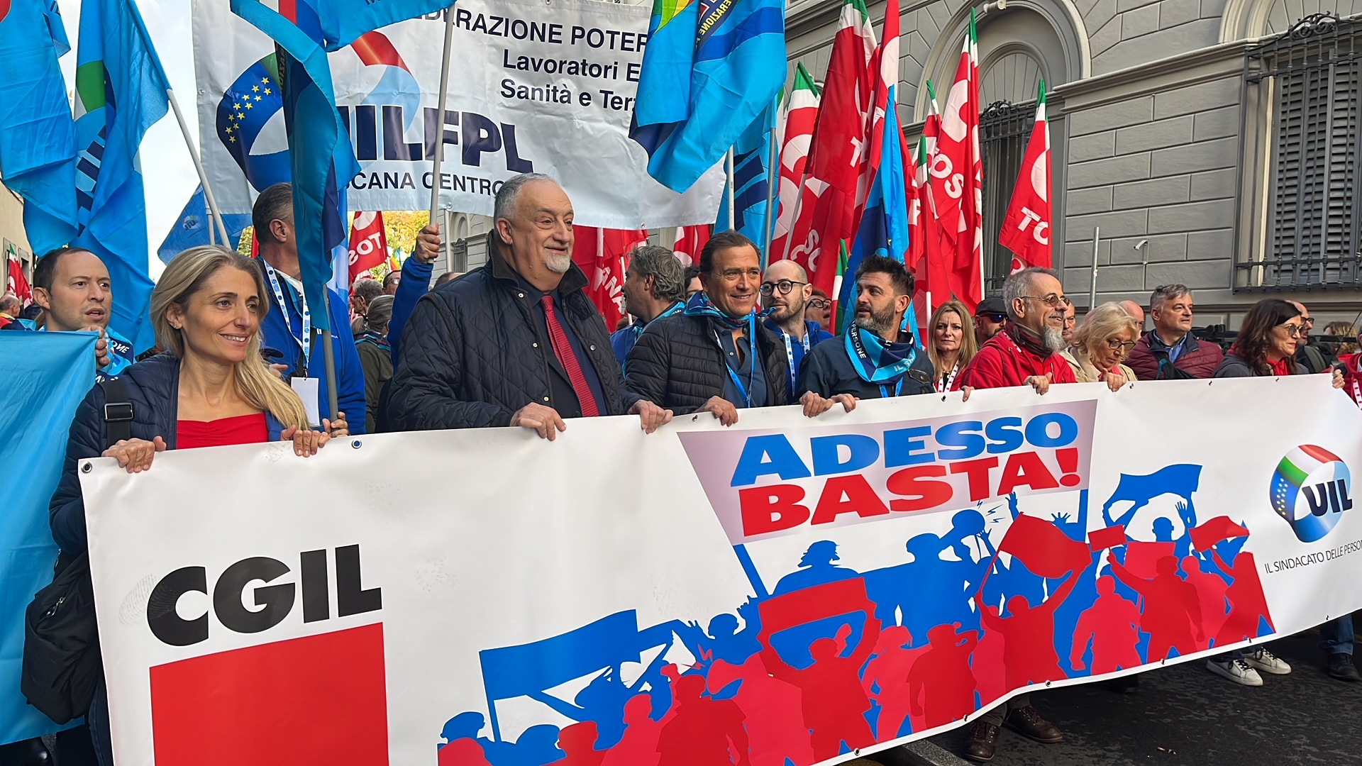 E ha proseguito: “Abbiamo i salari più bassi in Europa, vogliamo anche una riforma della pensione seria e poi la garanzia dello Stato sociale, servono risorse per la scuola, la sanità , il trasporto pubblico locale e serve tassare di più rendite e capitali, non il lavoro. Andremo avanti a manifestare fino a quando non lo otterremo”. Dal palco, Fantappiè ricorda alla CISL, grande assente, “che abbiamo avuto solo un incontro su questa manovra di bilancio, a ottobre, e questo non può essere il confronto che la CISL propone”. Adesso basta è il grido e lo striscione di apertura che segna la giornata di mobilitazione, dove hanno parlato anche rappresentanti della funzione pubblica dei due sindacati, oltre ad alcuni lavoratori, compreso alcuni del collettivo ex Gkn. Presenti il presidente della Regione Eugenio Giani, il Sindaco Dario Nardella, e molti assessori tra cui Benedetta Albanese e Sara Funaro che commenta così: “E’ una bellissima piazza con tantissimi lavoratori, tantissimi cittadini, una risposta forte al Governo e alle misure che sta mettendo in campo. E’ una piazza che dice no – ha sottolineato – a una serie di tagli, che dice no a tutta una serie di misure che non vanno incontro né ai cittadini né ai lavoratori, basti fare l’esempio delle manovre sul sociale, sulla sanità , sulle pensioni. Sono tanti temi sui quali c’è bisogno di far sentire in maniera forte e alta la voce, ed essere al fianco dei lavoratori, dei nostri cittadini”. A margine di una conferenza stampa, Eugenio Giani:”Mi sono sentito molto turbato da questo approccio verso una legittima manifestazione sindacale e sono venuto per difendere il diritto di sciopero e di libertà sindacale perché in un Paese che al primo articolo della Costituzione scrive che la Repubblica è democratica e fondata sul lavoro sentivo di dover essere qui”. Sul palco, le conclusioni sono state affidate a Francesca Re David, segretaria nazionale CGIL:”Il movimento dei lavoratori e delle lavoratrici ha sempre difeso la democrazia. Oggi assistiamo a una reazione molto importante a Salvini, che ha fatto un intervento da codice Rocco. Questa è una finanziaria autoritaria perche non l’hanno discussa con nessuno e lede i diritti dei lavoratori. Noi siamo in piazza e ci saremo ancora, il 24 a Nord e il 1 dicembre a Sud”.