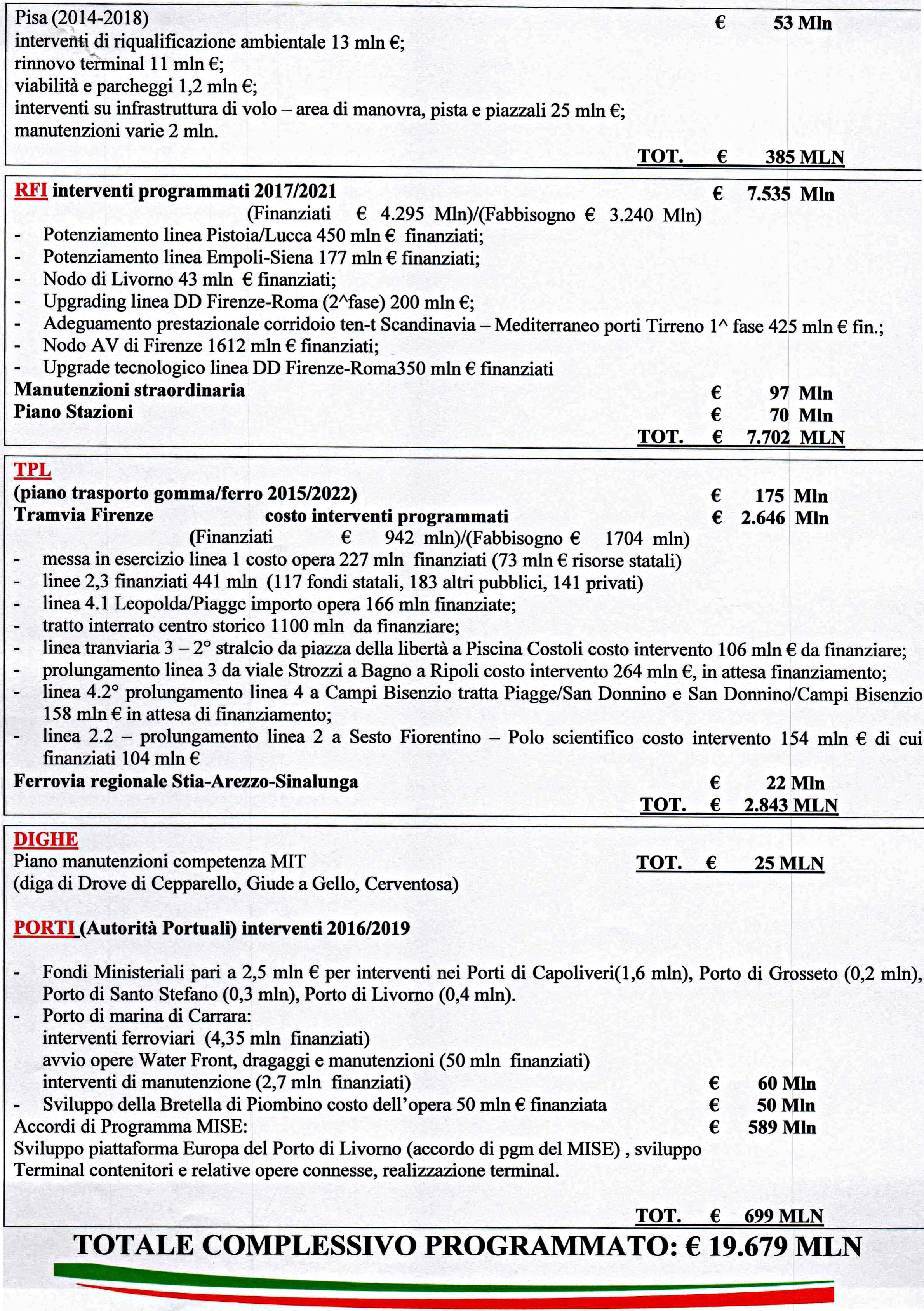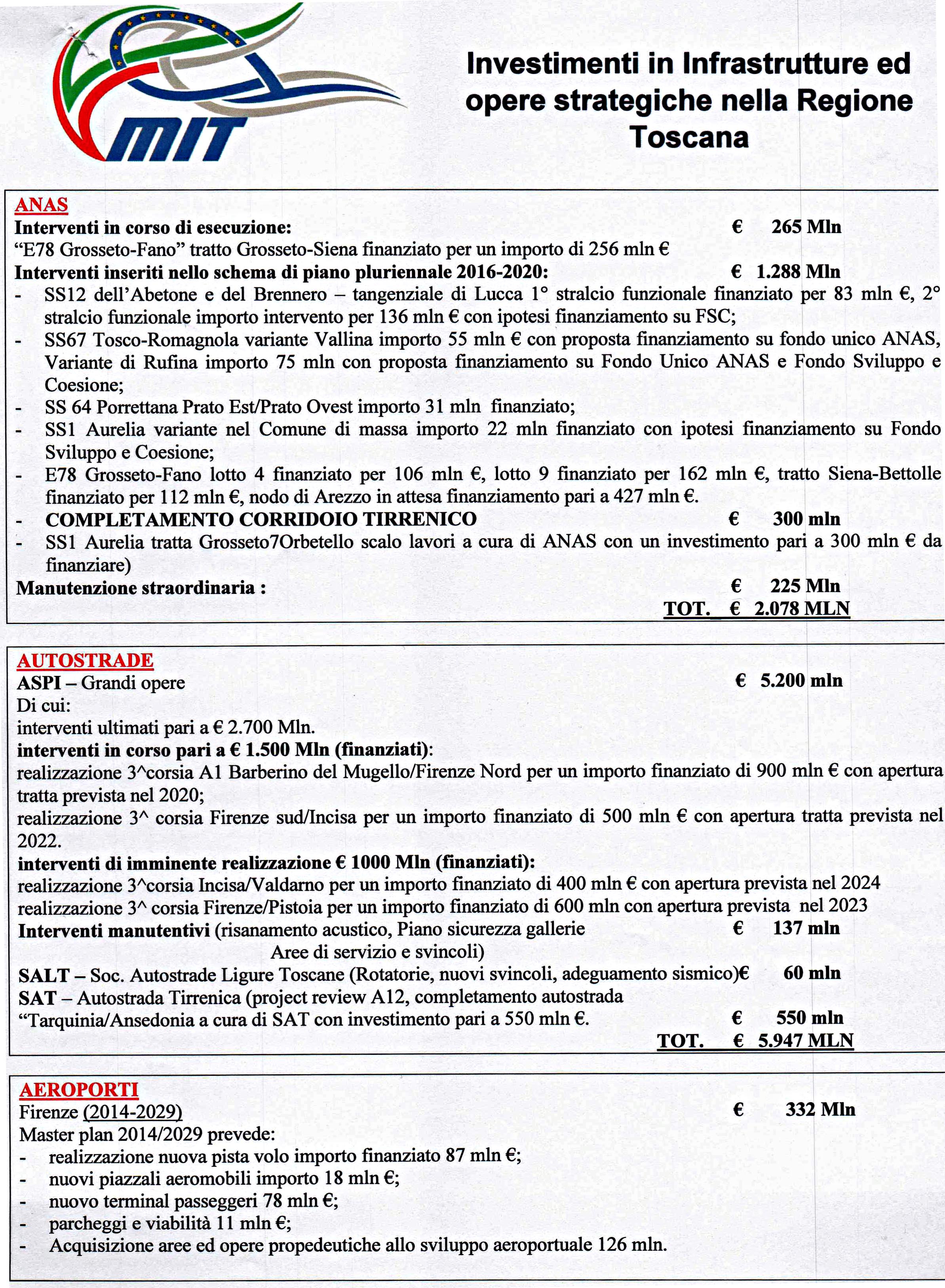 Quasi venti miliardi di euro quindi, appostati nel bilancio dello Stato, delle Ferrovie, di Anas e Autostrade per le infrastrutture in Toscana con gli ultimi governi.