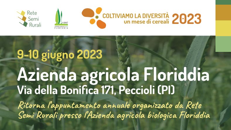 orna l’annuale appuntamento organizzato da Rete Semi Rurali ETS con un programma denso di attivitĂ e di nuovi spunti dalla ricerca in campo portata avanti insieme a partner europei e italiani. VenerdĂŹ 9 e sabato 10 giugno 2023 presso l’ Azienda Agricola Biologica Floriddia – Peccioli (PI).