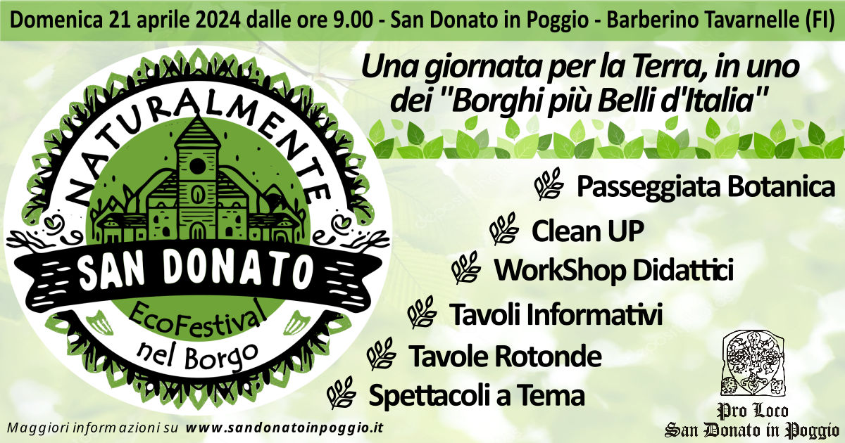 Domenica 21 aprile, a San Donato in Poggio (Barberino Tavarnelle) si svolgerĂ Naturalmente San Donato: EcoFestival nel Borgo: una giornata dedicata a promuovere la transizione ecologica e sensibilizzare la comunitĂ , in prossimitĂ della giornata mondiale della Terra (che sarĂ il giorno successivo, 22 aprile), come espressione di un territorio che coglie nella sostenibilitĂ unâopportunitĂ di crescita e sviluppo.