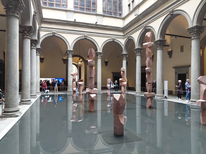 Otto grandi colonne in travertino rosa, composte da blocchi modulari e posizionate nel cortile all’interno di una grande vasca d’acqua che le riflette, insieme allo spazio circostante, il cielo e i visitatori. Si intitola ‘There are other fish in the sea’ (‘Ci sono altri pesci nel mare’), l’installazione realizzata appositamente per il cortile di Palazzo Strozzi a Firenze da Superflex, collettivo danese riconosciuto a livello internazionale per opere e progetti che ripensano il ruolo dell’arte in relazione a dinamiche sociali, economiche e ambientali del nostro tempo e fautore di un progetto di ‘architettura interspecie’. L’installazione, visibile fino al 2 agosto, nel 60mo anniversario dell’alluvione di Firenze del 1966, diventa il punto di partenza per promuovere un cambiamento di prospettiva nel nostro rapporto con l’ambiente, mettendo in discussione la tradizionale centralità attribuita all’essere umano.