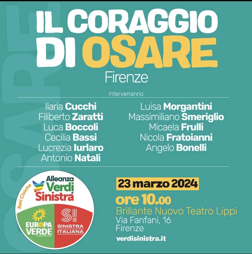 Domani Sabato 23 marzo 2024 ore 10, Brillante Nuovo Teatro Lippi (via Fanfani 16). Concludono Bonelli e Fratoianni. Diretta webtv su Facebook . Intervista con Lorenzo Falchi, sindaco di Sesto Fiorentino e membro della segreteria nazionale di Sinistra Italiana