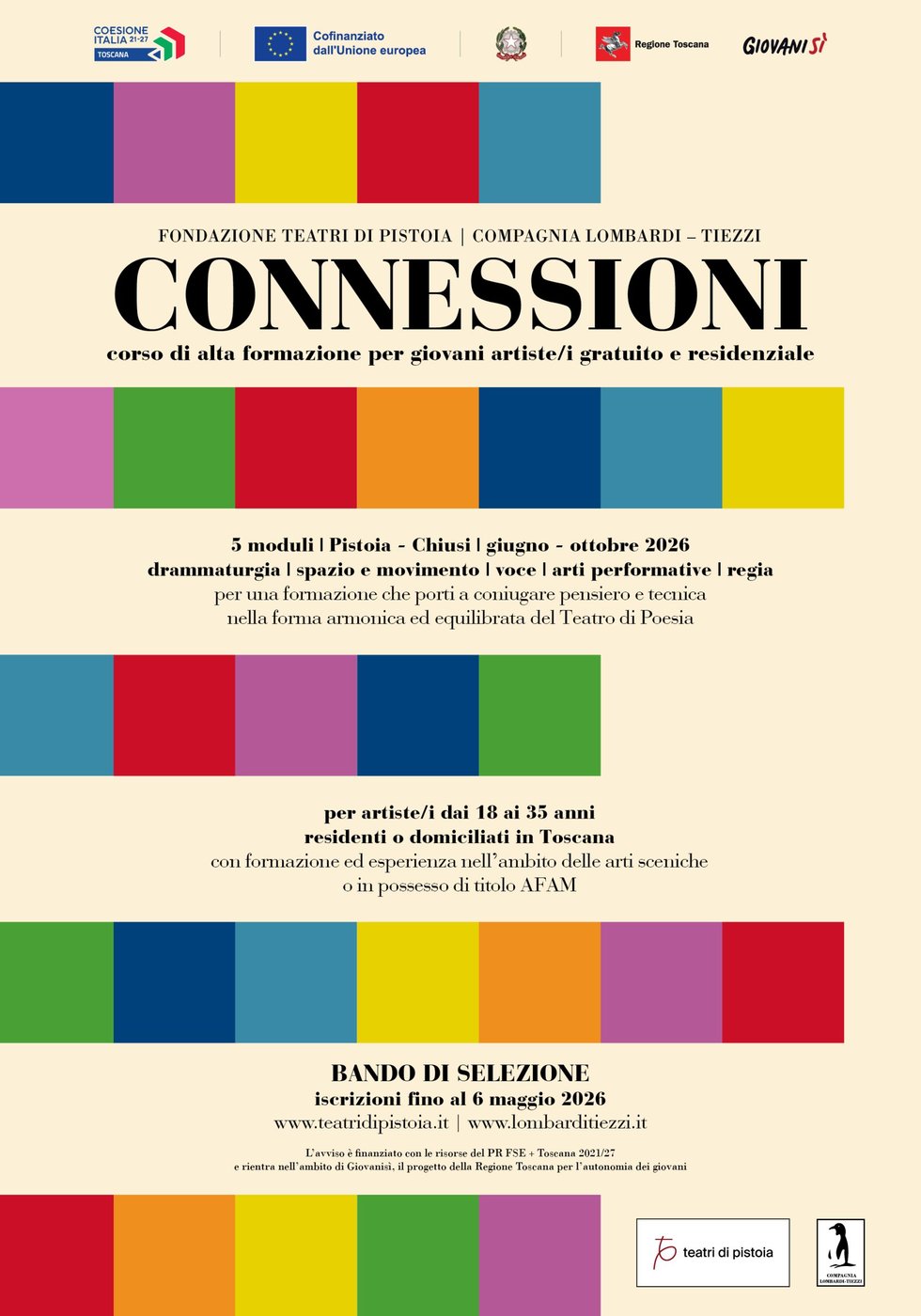È aperto il bando per “Connessioni”, il progetto di alta formazione dedicato a giovani artiste e artisti che intendono cosolidare e sviluppare il proprio percorso nelle arti performative. Promosso da Fondazione Teatri di Pistoia e Compagnia Lombardi-Tiezzi, il corso, gratuito e residenziale, è rivolto a partecipanti tra i 18 e i 35 anni con esperienza in teatro, danza, circo contemporaneo e performing arts. Con la direzione artistica e le docenze di Sandro Lombardi e Federico Tiezzi, il corso prevede cinque moduli residenziali tra Pistoia e Chiusi dedicati a il verso, lo spazio e il movimento, la voce, le arti performative e la regia.