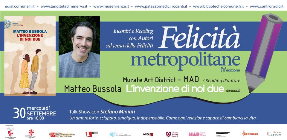 L’associazione culturale La Nottola di Minerva, nell’ambito del progetto Felicità metropolitane, in collaborazione con la Città Metropolitana, presenta Matteo Bussola L’invenzione di noi due. Einaudi. Reading d’autore. Talk Show con Stefano Miniati. Mercoledì alle 18:00 a Murate Art Distric.