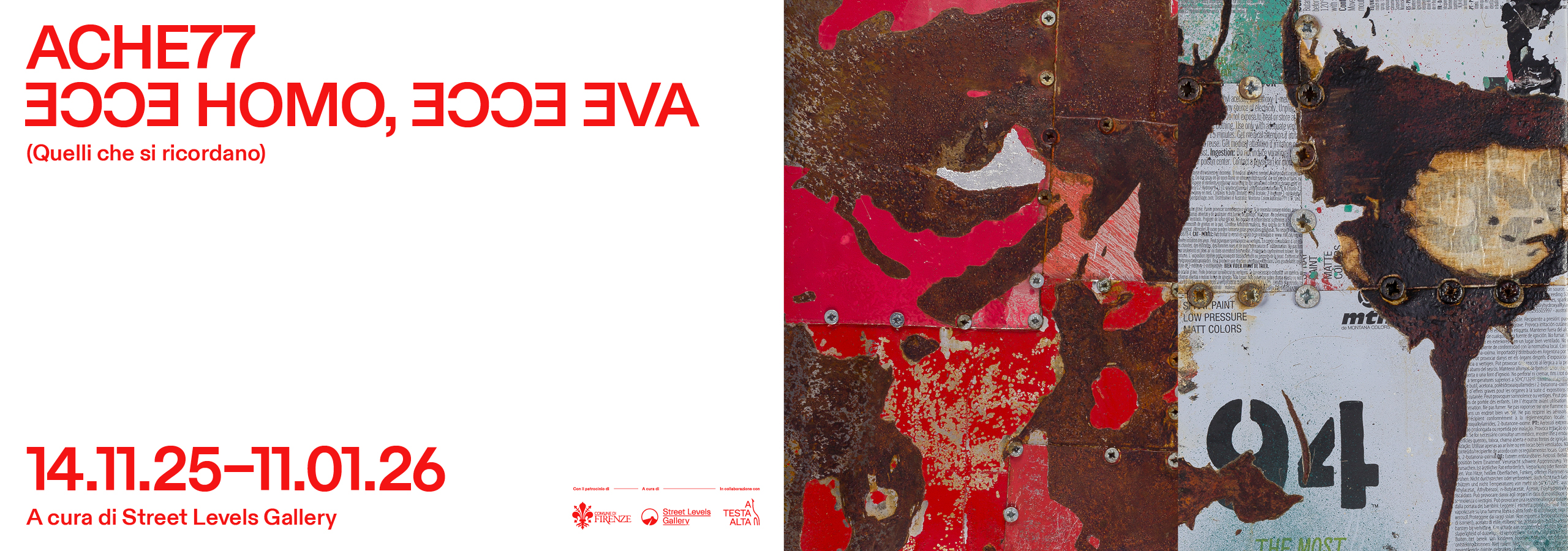 In parallelo alla mostra in Via Melegnano, sarà possibile visitare un secondo percorso dedicato all’artista nella galleria in via Palazzuolo 74AR, in cui saranno esposte opere appartenenti ad altre fasi della ricerca di Ache77, ampliando la riflessione sul rapporto tra identità, tempo e materia.