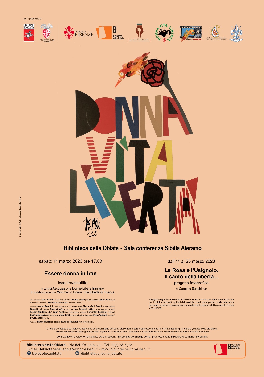 Associazione Donne Libere Iraniane in collaborazione con Movimento Donna Vita Libertà Firenze, in occasione della giornata internazionale della Donna e in occasione dell’inaugurazione della mostra fotografica sull’Iran del fotografo Carmine Sanchirico, farà luce sulla situazione delle donne iraniane dal passato ad oggi . Oltre ad interventi ci saranno delle performance e video registrati di poesie delle poetesse iraniane inviati dalle diverse città del mondo.