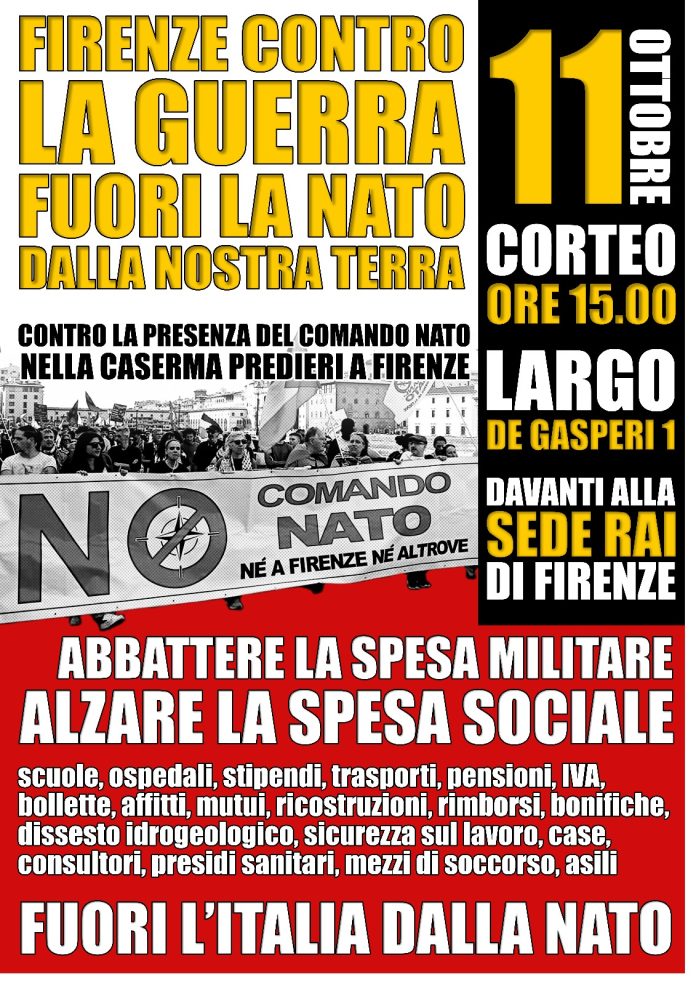 La manifestazione è partita da  Largo De Gasperi 1, davanti alla sede Rai di Firenze. Il Corteo è  contro la guerra, contro la NATO e contro le spese militari a svantaggio della spesa sociale.