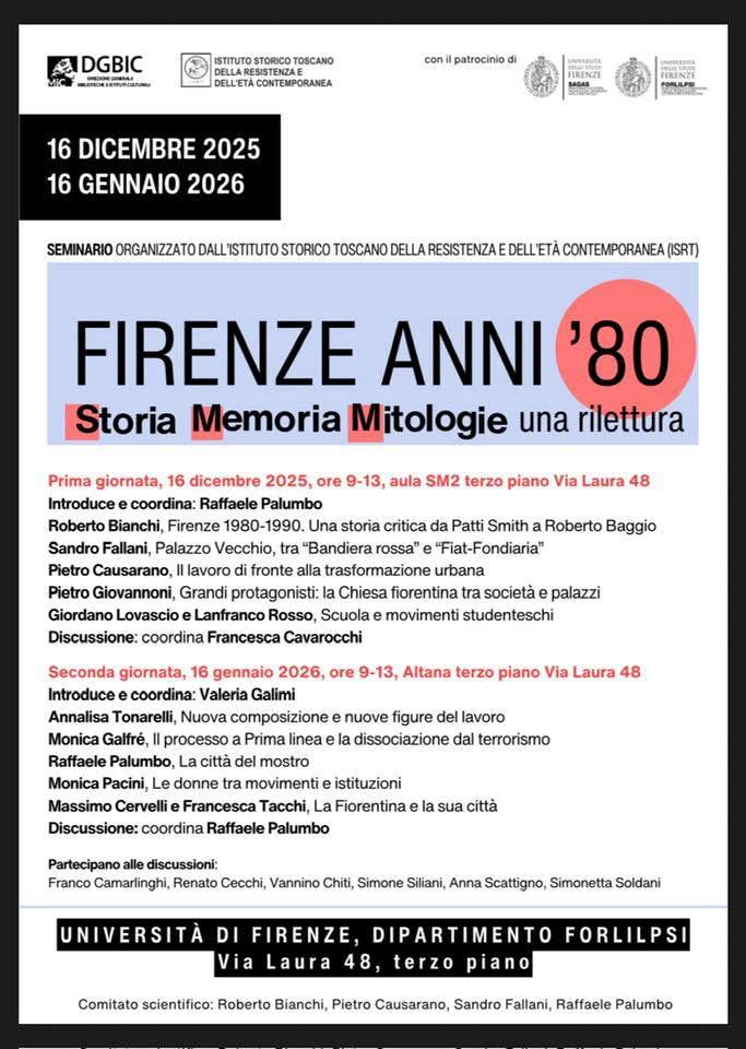 STORIA MEMORIA MITOLOGIE una rilettura. Due seminari per raccontare Firenze tra conflitti e trasformazioni. L’Istituto storico toscano della Resistenza e dell’Età contemporanea, con il patrocinio dell’Università degli studi di Firenze promuove due seminari su Firenze negli anni ’80. Martedì 16 dicembre 2025 e venerdì 16 gennaio 2026 dalle ore 09:00 alle ore 13:00 presso il Dipartimento di Formazione, Lingue, Intercultura, Letterature e Psicologia in via Laura 48 (III piano). Dal concerto di Patti Smith alla rivolta dei tifosi per l’addio di Baggio alla Fiorentina, dalla vertenza Fiat all’assassinio di Lando Conti i temi trattati. Roberto Bianchi è docente di Storia contemporanea Unifi e membro del comitato scientifico del convegno.