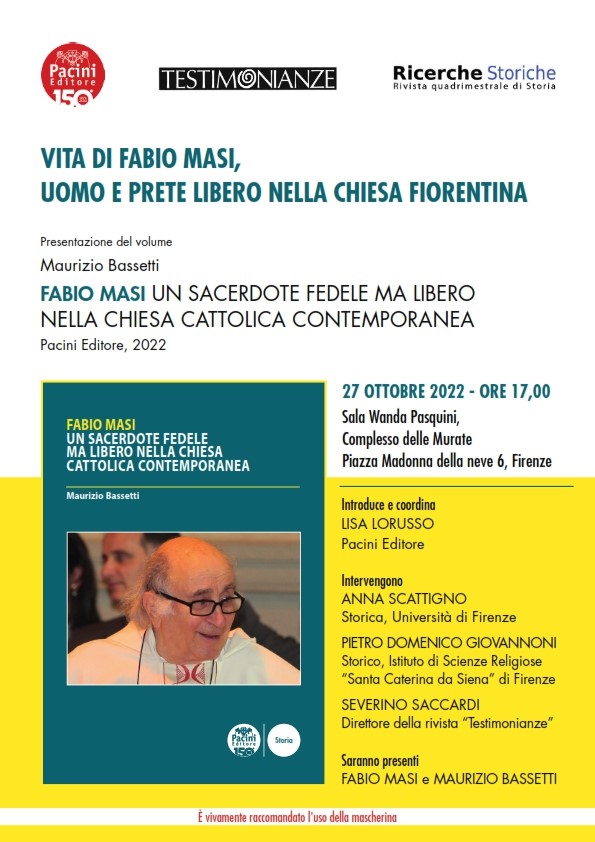 Un libro che colma una lacuna storiografica ponendo all’attenzione del pubblico una figura di rilievo della Chiesa fiorentina. Verrà presentato il 27 ottobre 2022 alle ore 17,00 presso la sala Wanda Pasquini alle Murate (Piazza Madonna della Neve, 6 Firenze) il libro Fabio Masi. Un sacerdote fedele ma libero nella Chiesa cattolica contemporanea, di Maurizio Bassetti (Pacini Editore).