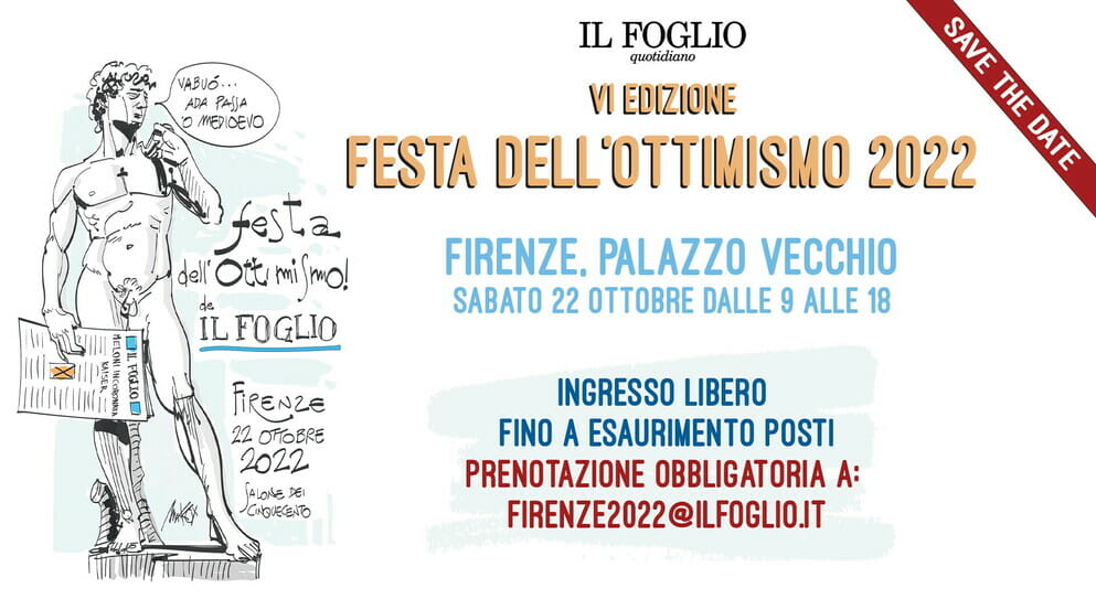Sabato 22 ottobre dalle 9 alle 19 a Firenze, nel Salone dei Cinquecento di Palazzo Vecchio, si terrà la sesta edizione della Festa dell’Ottimismo, l’evento organizzato dal Foglio con i protagonisti della politica e della cultura.