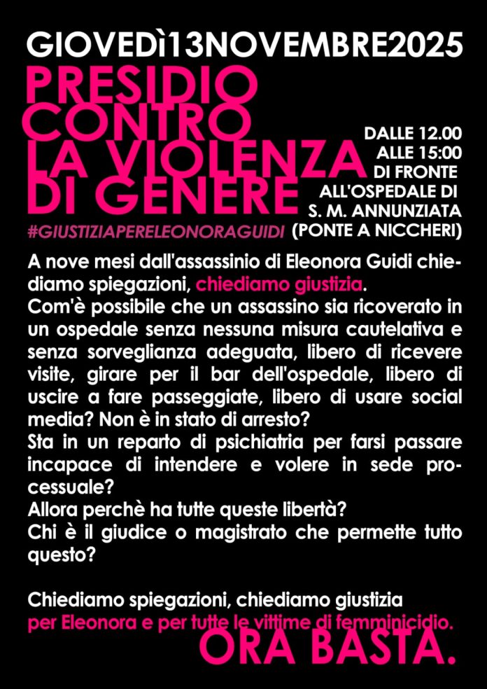 L’uomo, dopo un tentato suicidio, è stato ricoverato nel reparto di psichiatria. Il gip ha disposto per lui la misura di sicurezza in attesa di una seconda perizia che dovrebbe avvenire in queste settimane. Nella prima valutazione dei periti è stato definito per ora incapace di affrontare un processo. Di quel giorno non ricorda nulla. E’ libero di girare all’interno del perimetro dell’ospedale, e ricevere visite. Una gestione che ha turbato la comunità e lo stesso sindaco di Rufina, Daniele Venturi, si sarebbe attivato per capire la vicenda in procura. Intanto per Giovedì 13 novembre dalle 12 alle 15 davanti all’ospedale di Santa Maria Annunziata, è stato promosso da un gruppo di donne della Valdisieve (con adesione tuttora in corso) un presidio sul territorio a sostegno della famiglia di Eleonora, per chiedere giustizia e spiegazioni.