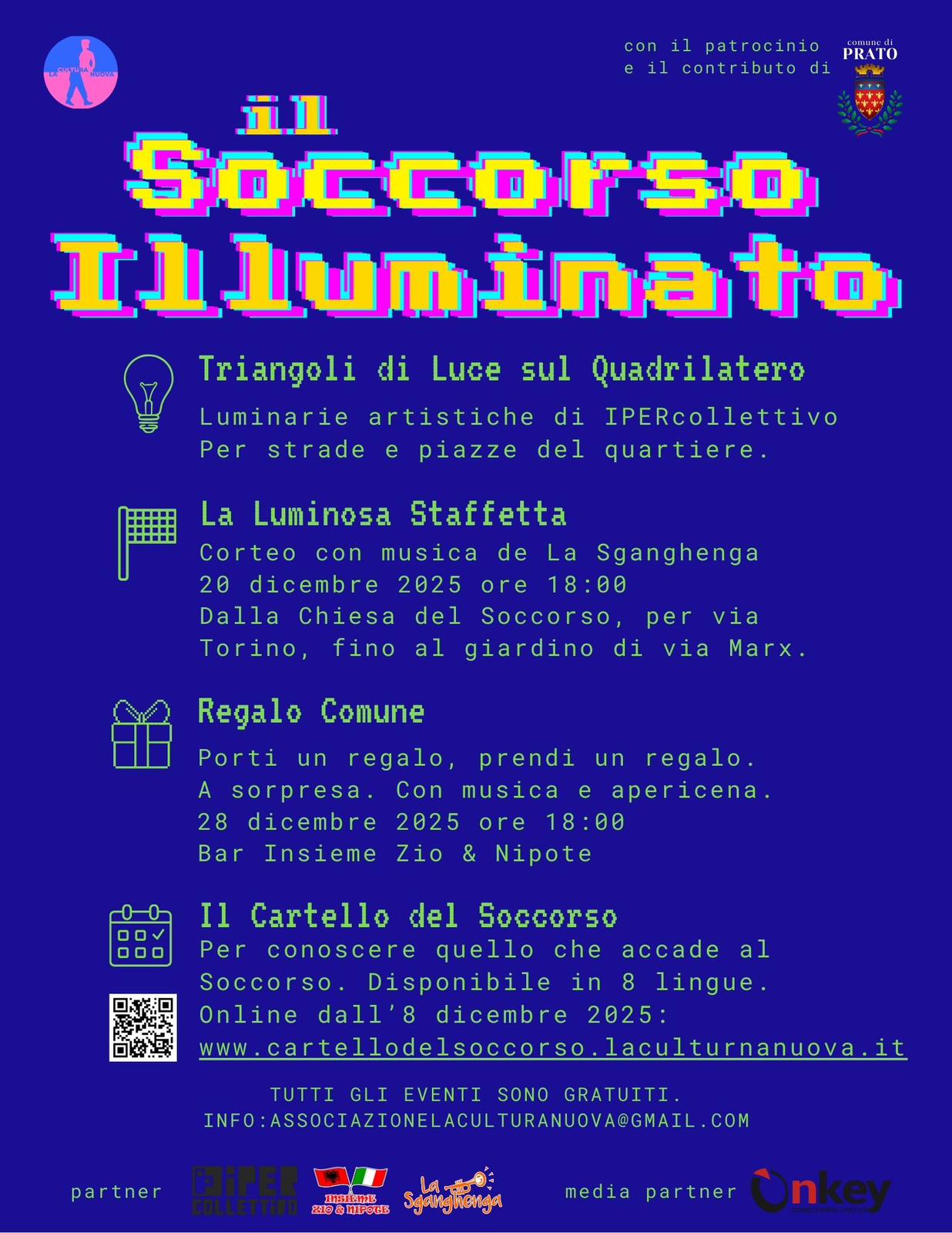 Si accendono le feste al Soccorso. Luminarie artistiche, eventi e laboratori per “Il Soccorso Illuminato”, un progetto culturale e artistico dell’Associazione La cultura Nuova con il patrocinio ed il contributo del Comune di Prato. Un’iniziativa nata per valorizzare il territorio e dare vita ad un quartiere di Prato con le luminarie artistiche di “Triangoli di Luce sul Quadrilatero”, installazioni a cura di IperCollettivo realizzate con materiali di riciclo provenienti dalle industrie tessili della città. Questa mattina Giorgio Bernardini è in diretta da Prato con Luca Cortina, presidente dell’associazione la Cultura Nuova.