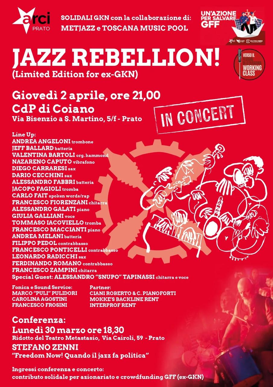 Jazz Rebellion 1 Aprile 2026 0 Condividere FacebookTwitterPinterestWhatsAppEmailStampaTelegram www.controradio.it Jazz Rebellion Play Episode Pause Episode Mute/Unmute Episode Rewind 10 Seconds 1x Fast Forward 30 seconds 00:00 / 00:07:32 Subscribe Share RSS Feed Share Link Embed 20 MUSICISTI JAZZ PER GKN. “JAZZ REBELLION!” IN CONCERTO ALLA CASA DEL POPOLO DI COIANO, giovedì 2 aprile alle ore 21:00.