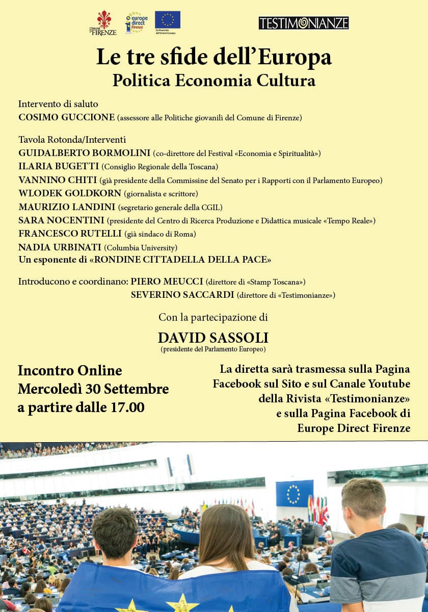 L’incontro di Testimonianze con David Sassoli, Guidalberto Bormolini, Maurizio Landini, Francesco Rutelli, Nadia Urbinati ed altri. Oggi alle 17:00 sui social di Testimonianze e Europe Direct Firenze.