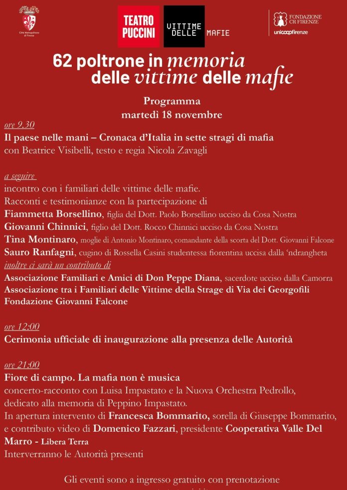 Questa mattina con Raffaele Palumbo e i suoi ospiti siamo in diretta dal Teatro Puccini di Firenze per la cerimonia di inaugurazione del progetto “Vittime delle mafie”. Il progetto prevede la dedica di 62 poltrone del teatro alle vittime delle mafie, ciascuna contrassegnata dal nome e da un QR code che ne racconta la storia. Un’iniziativa che vuole unire memoria, cultura e impegno civile, per ricordare coloro che hanno sacrificato la vita nella difesa della legalità e dei valori democratici.