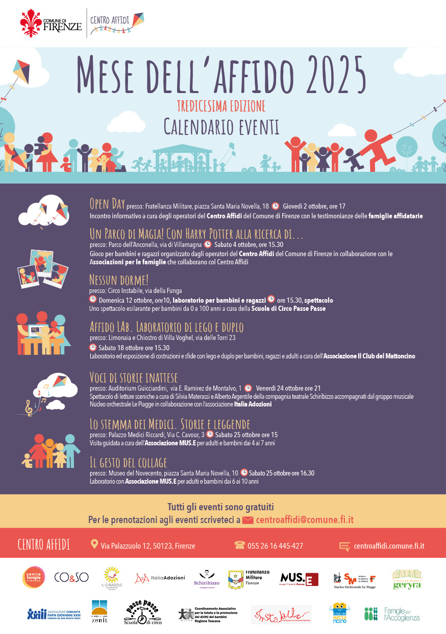 Dal 2 ottobre la tredicesima edizione che apre con il consueto Open day informativo. Tante le iniziative per bambini, ragazzi e famiglie. Anche per il 2025 torna il Mese dell’Affido, tredicesima edizione, con le sue iniziative gratuite rivolte a bambini, ragazzi e alle famiglie. Si inizia giovedì 2 ottobre con l’Open day presso la Fratellanza Militare, piazza Santa Maria Novella 18, dalle ore 17, un incontro informativo a cura degli operatori del Centro Affidi del Comune di Firenze con le testimonianze delle famiglie affidatarie. Si prosegue sabato 4 ottobre alle 15,30 con l’evento “Un parco di magia! Con Harry Potter alla ricerca di…” al Parco dell’Anconella (via di Villamagna), un gioco per bambini e ragazzi organizzato dagli operatori del Centro Affidi in collaborazione con le Associazioni per le famiglie che collaborano con Centro.