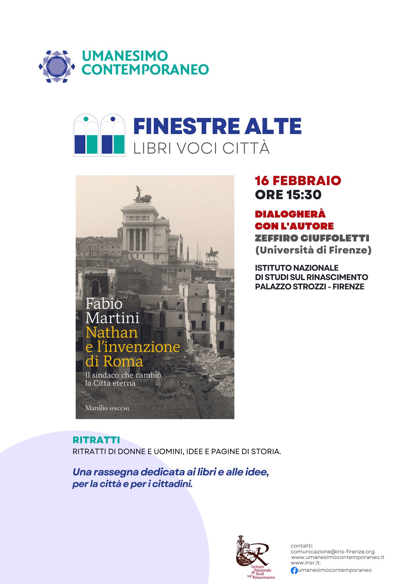Per la rassegna “Finestre alte. Libri voci città”, Fabio Martini presenta il suo ultimo libro “Nathan e l’invenzione di Roma. Il Sindaco che cambiò la città eterna” (Marsilio 2021). Il 16 febbraio 2023 alle ore 15:30 all’Istituto Nazionale di studi sul Rinascimento, a Palazzo Strozzi, Firenze.