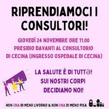 Non Una di Meno Livorno assieme a Non Una Di Meno Pisa e Obiezione Respinta organizza  giovedì,  24 novembre 2022, dalle ore 11,00 alle ore 14.00,  un presidio a Cecina, nella zona davanti all’ingresso principale dell’ospedale  per denunciare le forti carenze di servizio del Consultorio Delle Valli Etrusche.