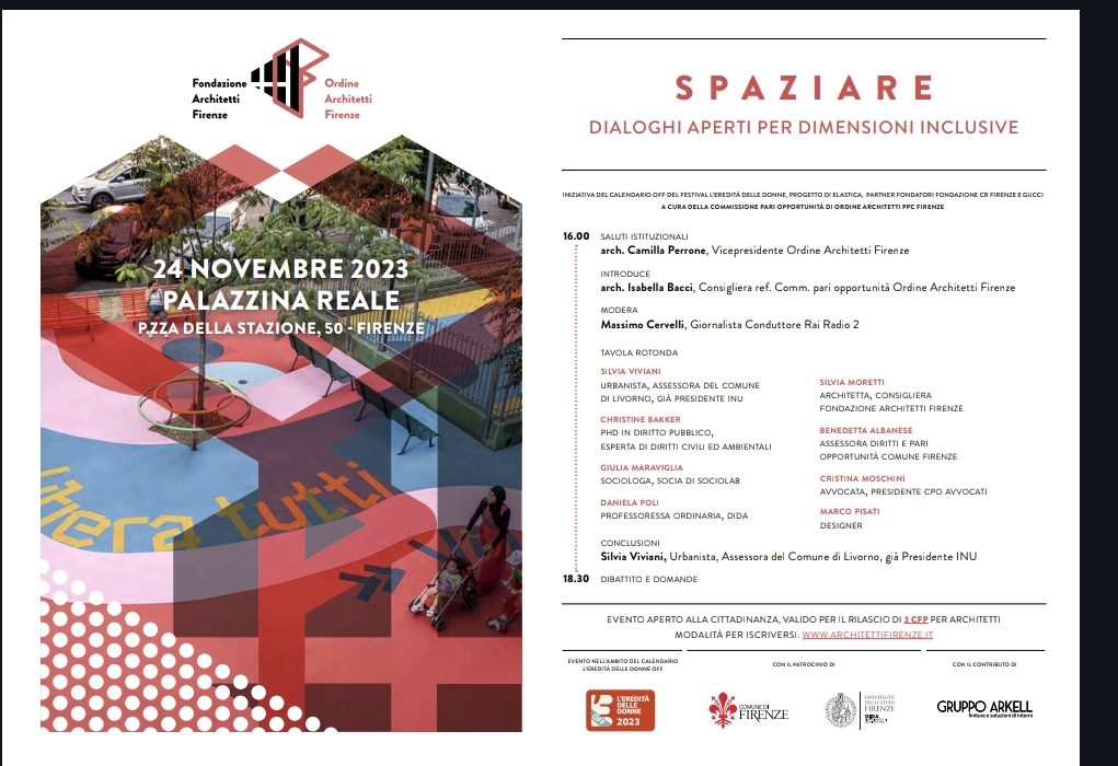 Partendo dalla lettura di brani estratti a cura della CPO di Oaf-Faf, la volontà è quella di indurre un dibattito sullo spazio – elemento cardine del progetto di architettura leggendolo attraverso il filtro delle politiche di genere con il fine di progettare spazi fruibili da tutte e da tutti. Il 24 novembre dalle 16 alla palazzina Reale. intervista con l’arch. Isabella Bacci, commissione pari opportunità OAF