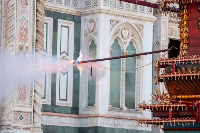 La ‘colombina’ è il congegno trasportato da un razzo innescato dal cero santo – ‘accensione’ a opera dell’arcivescovo di Firenze, monsignor Gherardo Gambelli, all’interno della Cattedrale -, che ‘incendia’ il carro posizionato tra Duomo e Battistero, o meglio i petardi e i fuochi pirotecnici di cui è corredato. In una giornata di sole e con una piazza come sempre gremita di migliaia di persone tra fiorentini e turisti, la ‘colombina’, partita dall’altare della Cattedrale, ha raggiunto all’esterno il carro di fuoco, detto Brindellone, e poi è tornata indietro, lungo la navata centrale, senza problemi. La tradizione tramanda che se riesce a volare e a rientrare senza intoppi è segno di speranza e di buoni raccolti. Come da tradizione anche la benedizione alla folla e al Brindellone, prima che fosse acceso, da parte di monsignor Gambelli. Dopo lo Scoppio del carro la rrosecuzione della messa in Duomo, celebrata dall’arcivescovo. Tra i presenti la sindaca di Firenze Sara Funaro e anche il presidente della Toscana Eugenio Giani. La storia affida a Pazzino de’ Pazzi, al ritorno da una crociata nel 1099, le origini dello Scoppio del carro. Fu Pazzino, a riportare alcune pietre focaie del sepolcro di Cristo con le quali poi a Firenze venivano illuminate le celebrazioni del Sabato santo. In un secondo tempo la cerimonia venne spostata alla domenica e i fiorentini decisero di costruire un carro trionfale, detto Brindellone, che ancora oggi è scortato fino in piazza Duomo dagli armigeri del Comune nei tipici costumi. La forma attuale del carro risale al ‘600. Per tutto l’anno il Brindellone resta in un apposito deposito di via il Prato e il giorno di Pasqua arriva al Duomo trascinato da quattro buoi, agghindati per la festa.