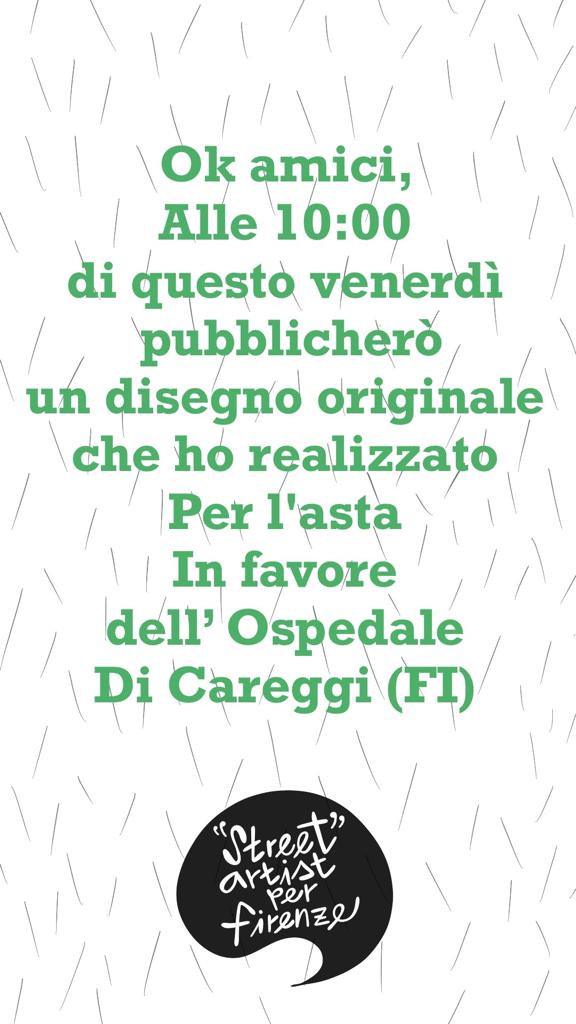 L’asta partirà venerdì 3 aprile alle ore 10:00 e terminerà sabato 4 aprile alle ore 12:00. Gli Street artist pubblicheranno le opere sul proprio profilo Instagram, con l’hashtag #streetartistperfirenze così le persone tramite questo tag potranno vedere i lavori di tutti gli street artists.