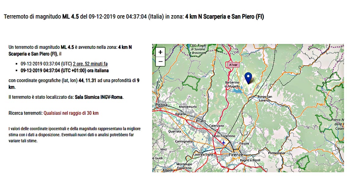 Un Terremoto 4.5 facente parte di una serie di scosse di terremoto è stato registrato a Scarperia e San Piero, in provincia di Firenze, nel Mugello.