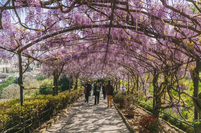 È tornato a tingersi delle mille sfumature di lilla il tunnel del Giardino Bardini. Ogni primavera il pergolato decorato con tante varietà di glicine si trasforma in uno dei più suggestivi spettacoli naturali della città: un tunnel incantato di 70 metri, avvolto da sfumature che vanno dal lilla al violetto, dall’azzurro malva al rosato. Villa Bardini è aperta al pubblico grazie a Fondazione CR Firenze che la sostiene attraverso la sua strumentale Fondazione Parchi Monumentali Bardini e Peyron ETS.